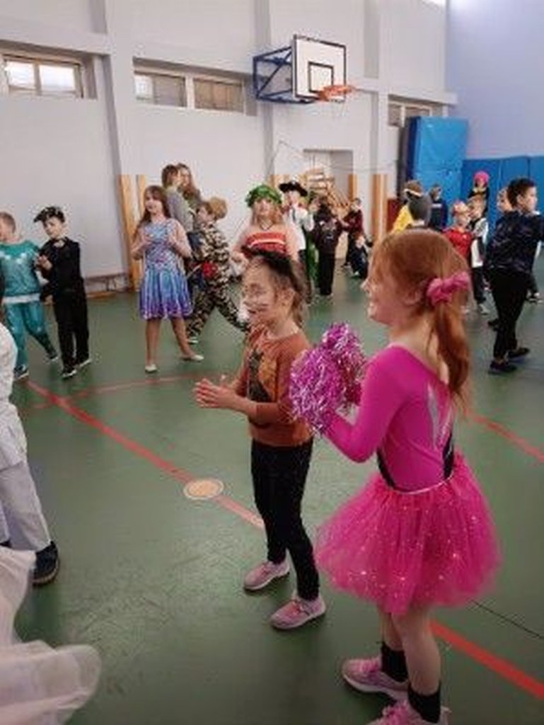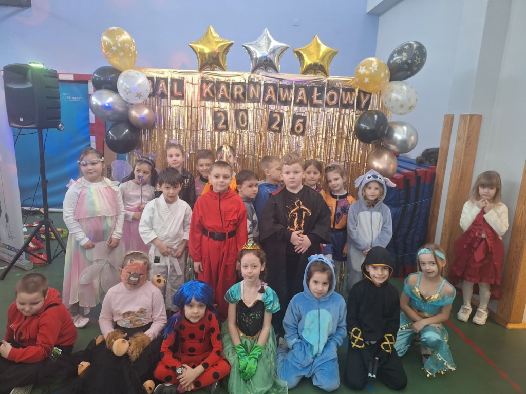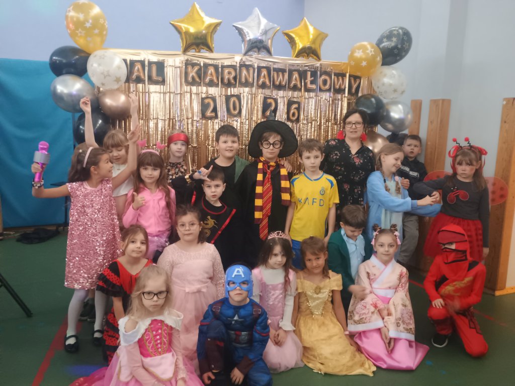 Uczniowie pojawili się w pięknych, kolorowych przebraniach karnawałowych – w sali można było spotkać księżniczki, superbohaterów, zwierzątka i bajkowe postacie. Całości dopełniały największe muzyczne hity, przy których dzieci tańczyły z ogromnym zaangażowaniem. Bal odbył się w świetnej atmosferze, pełnej radości, uśmiechu i wspólnej zabawy.