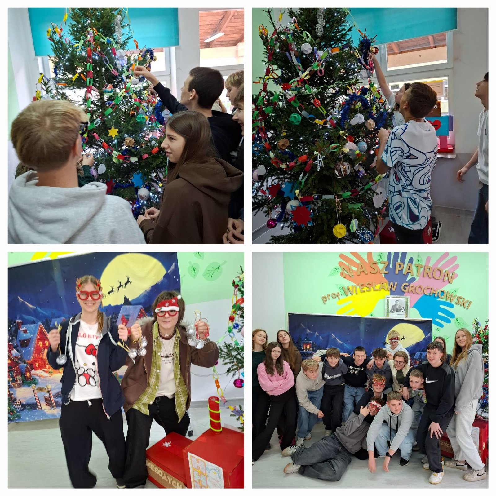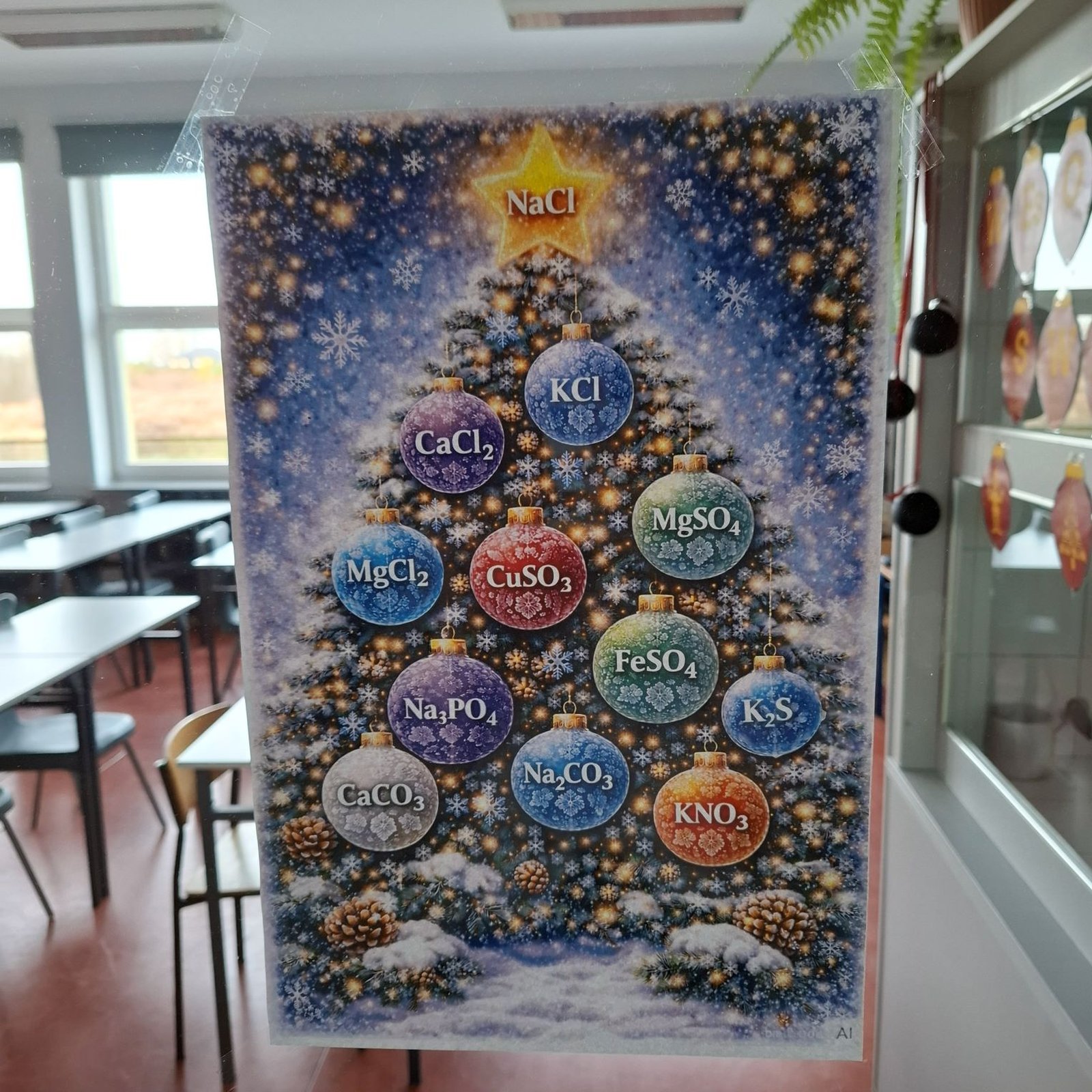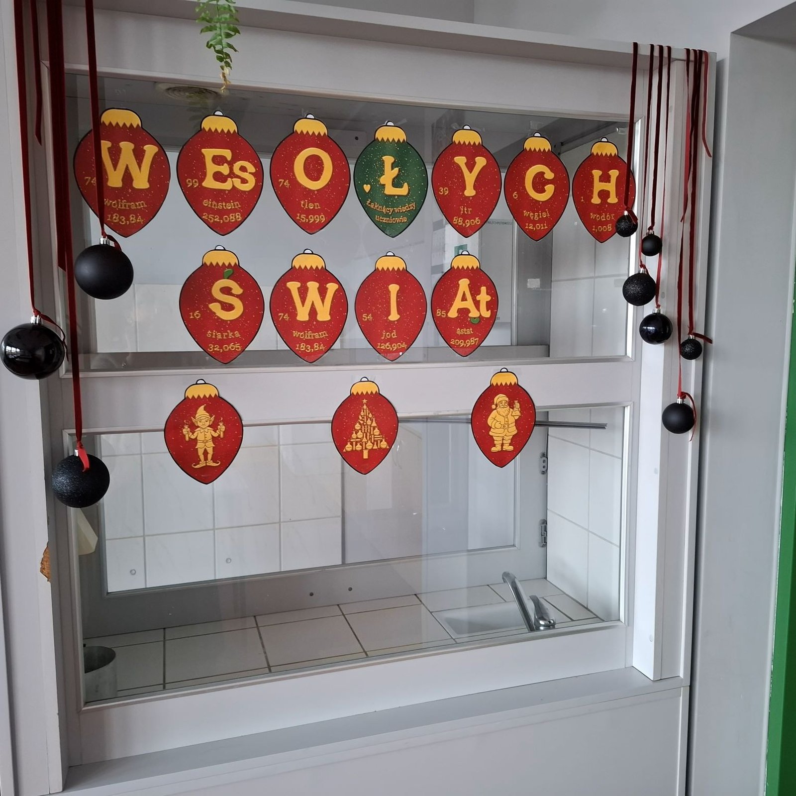 Drzwi do pracowni chemicznej ozdobiła piękna choinka z niepowtarzalnymi bombkami, których nazwy uczniowie chętnie podawali podczas zajęć, utrwalając w ten sposób zdobytą wiedzę. Taka forma powtórki sprawiła, że nauka stała się przyjemnością, a lekcja chemii na długo pozostanie w pamięci uczniów jako przykład twórczego połączenia wiedzy, kreatywności i świątecznego klimatu.