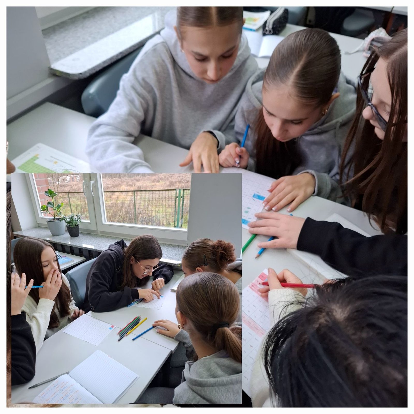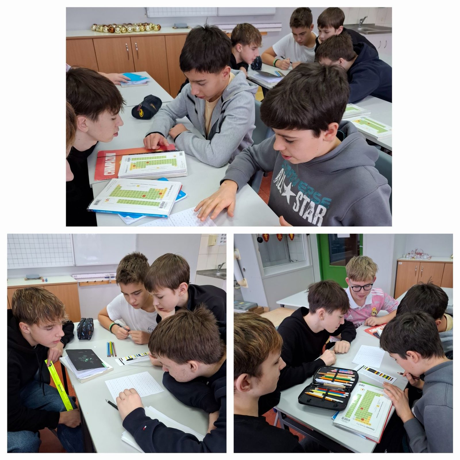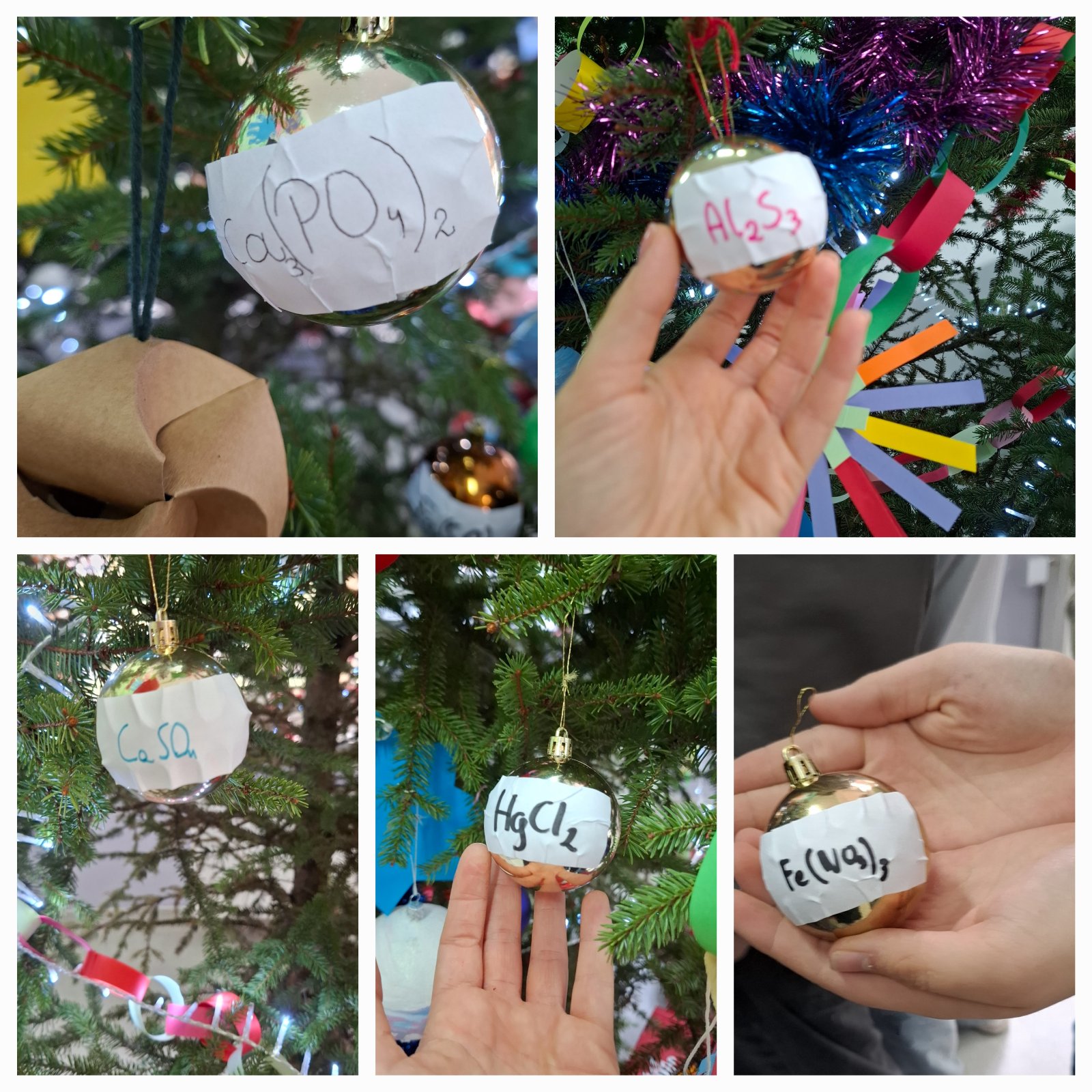 Podczas lekcji pojawiły się także chemiczne kolorowanki. Zadaniem uczniów było odnalezienie właściwego wzoru chemicznego do podanej nazwy soli i pokolorowanie go odpowiednim kolorem. Prawidłowo wykonane zadania utworzyły obraz bombki, który dopełnił świąteczną aranżację sali.