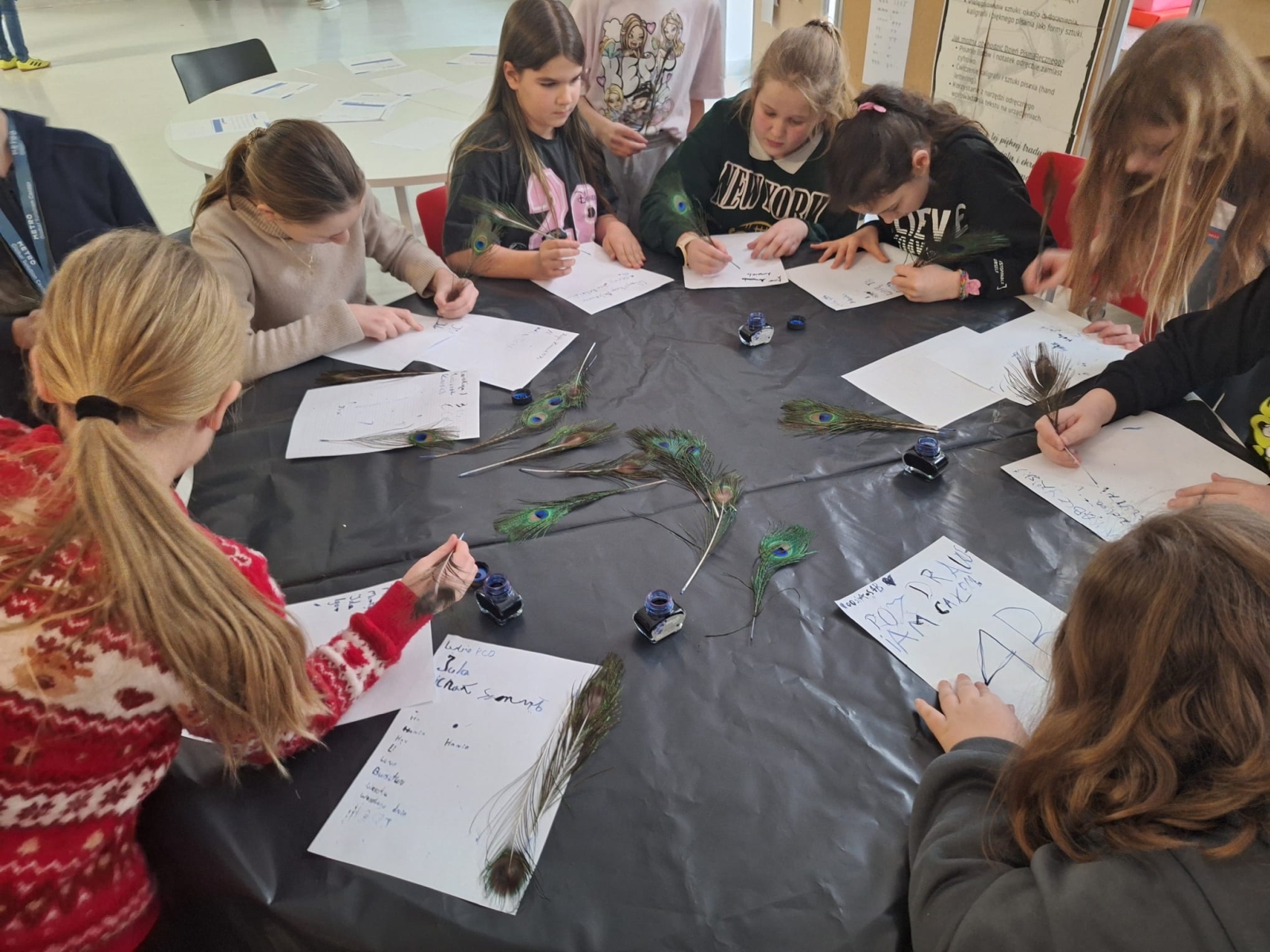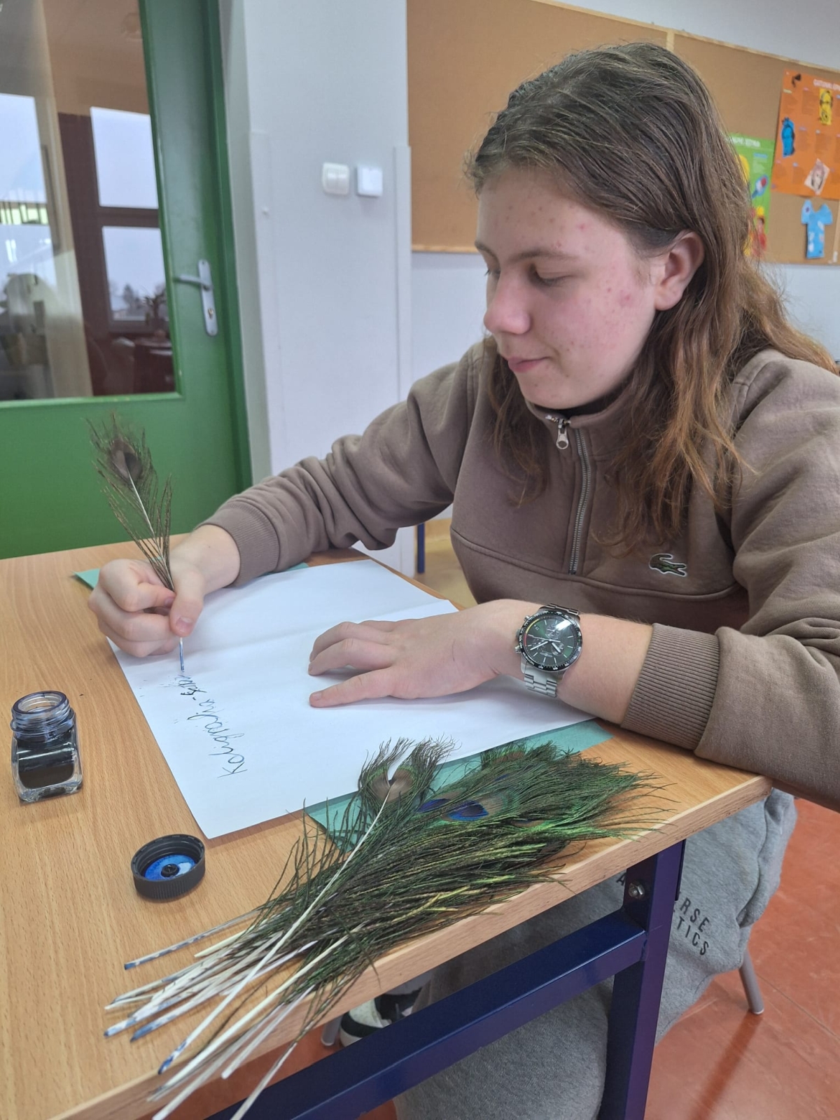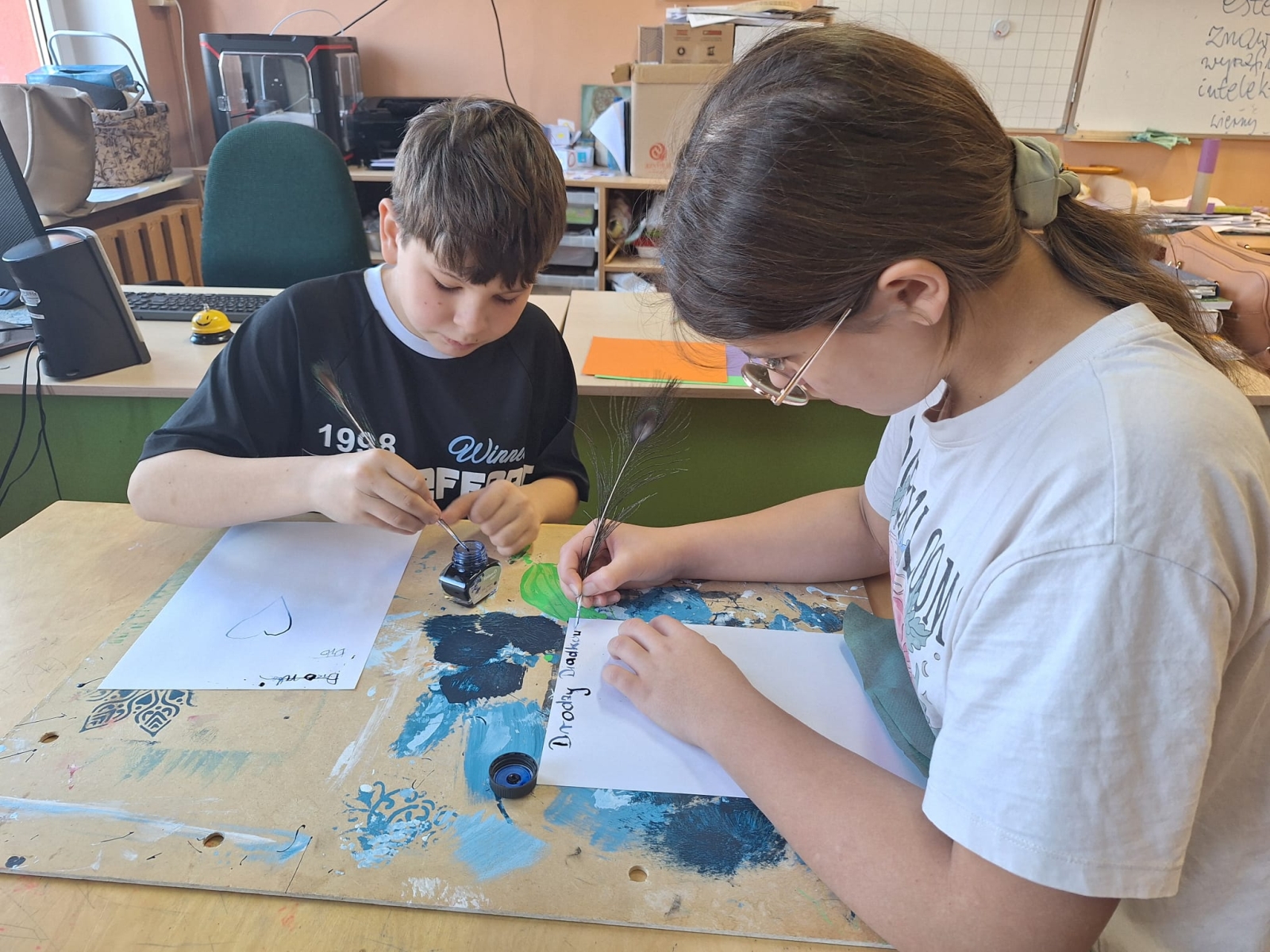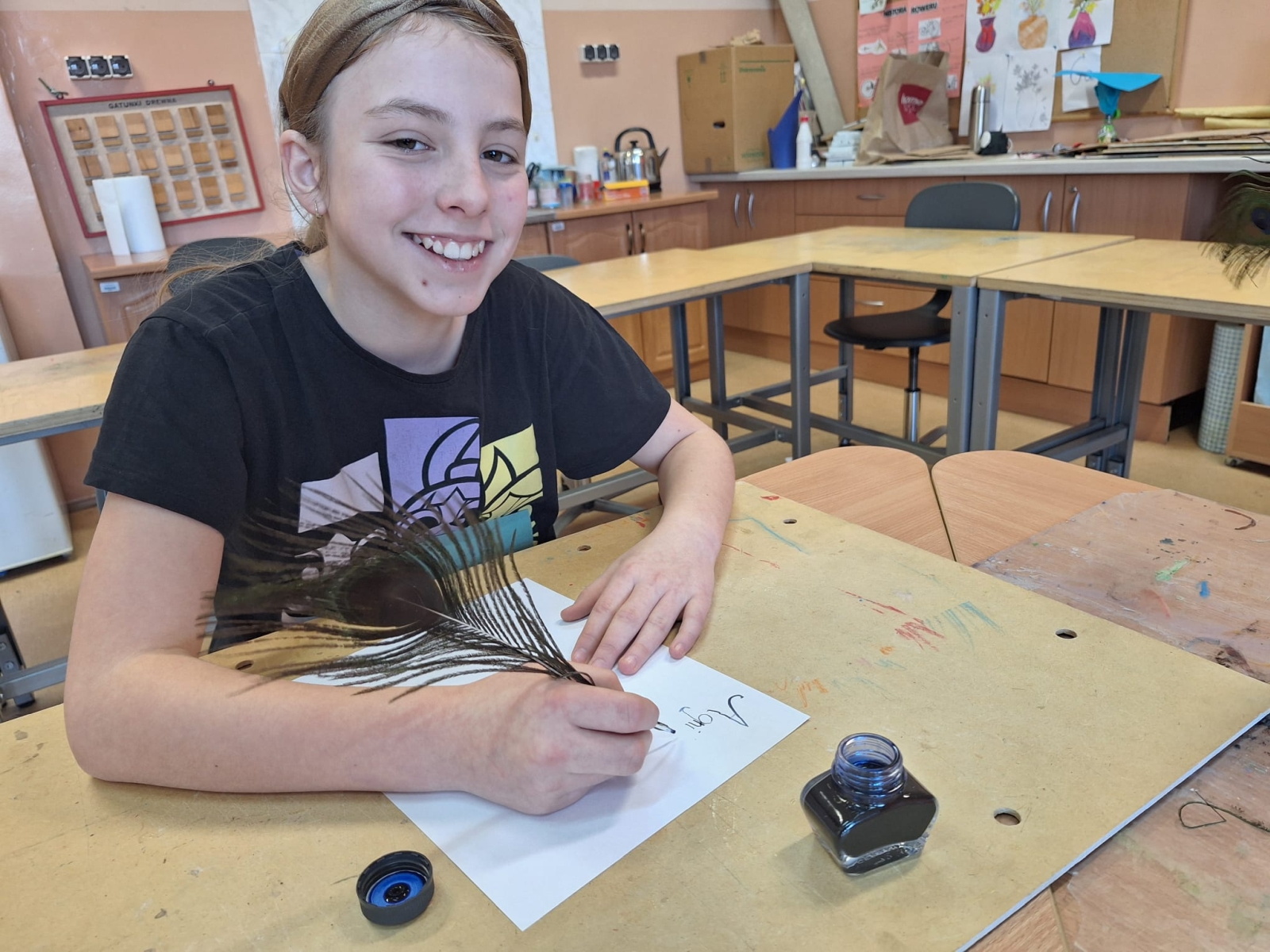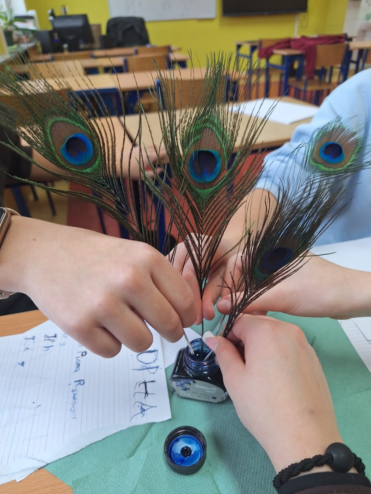 W naszej szkole podczas przerwy uczniowie bawili się z kaligrafią w sposób niecodzienny. Zamienili długopisy na pióra ptasie i atrament w kałamarzach. Kaligrafia jeszcze nigdy nie była tak fascynująca, co można zaobserwować na załączonych zdjęciach.