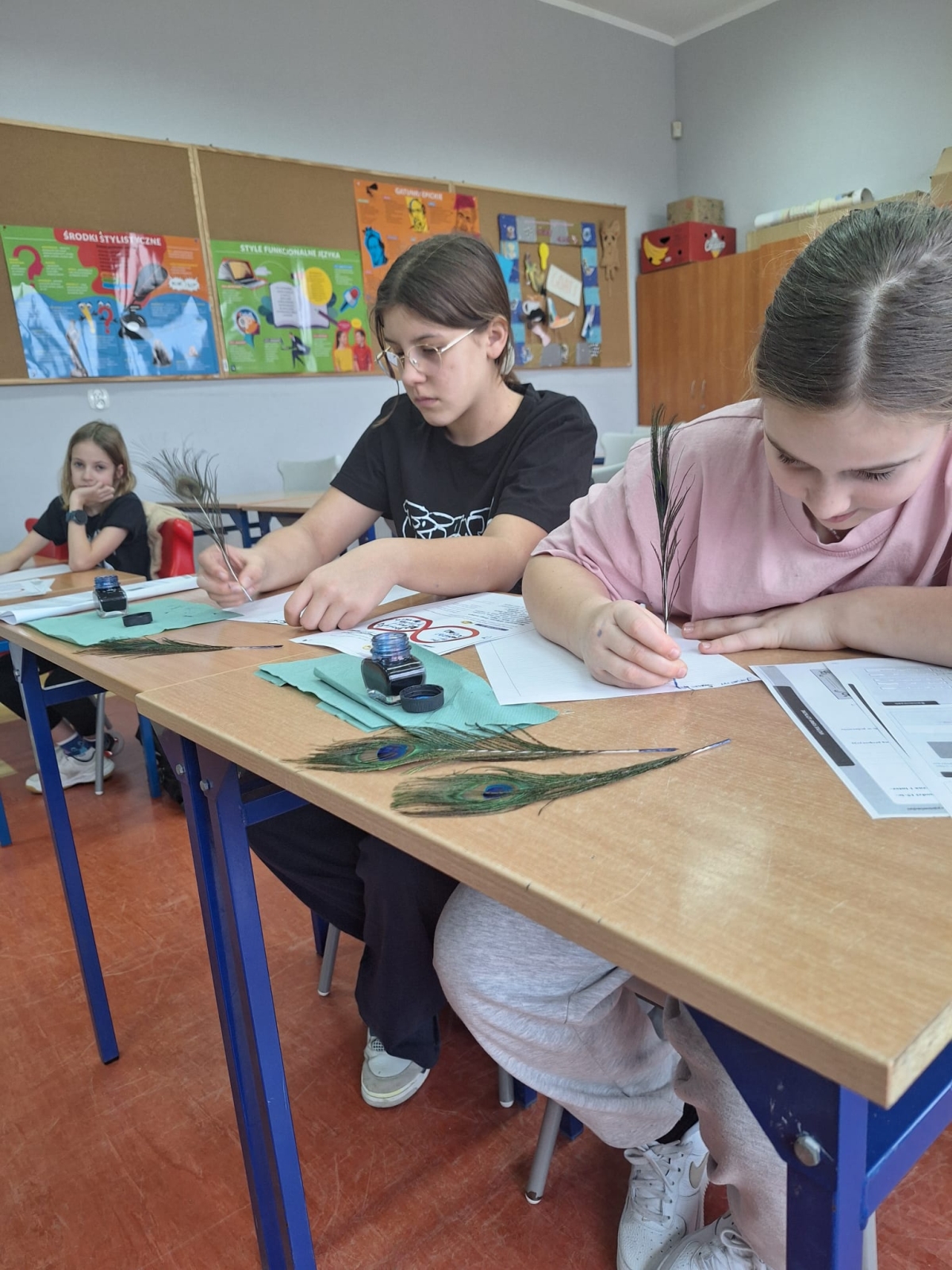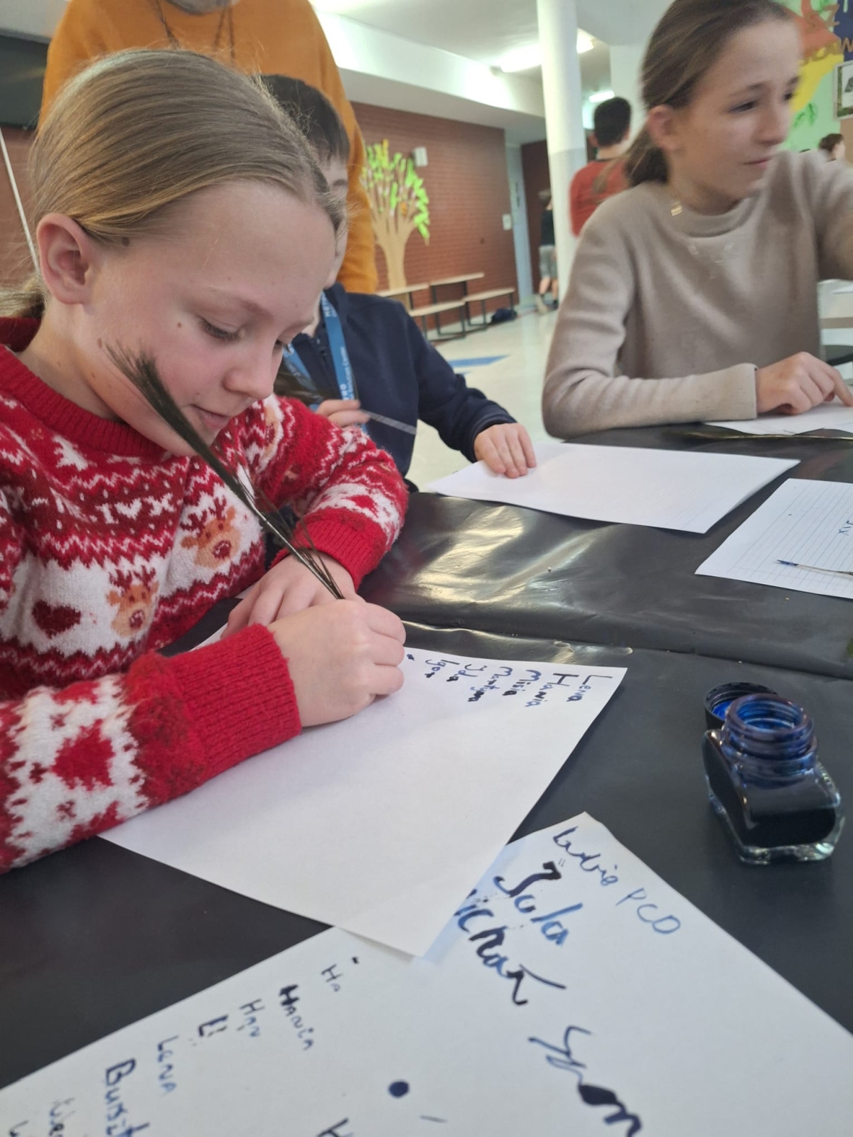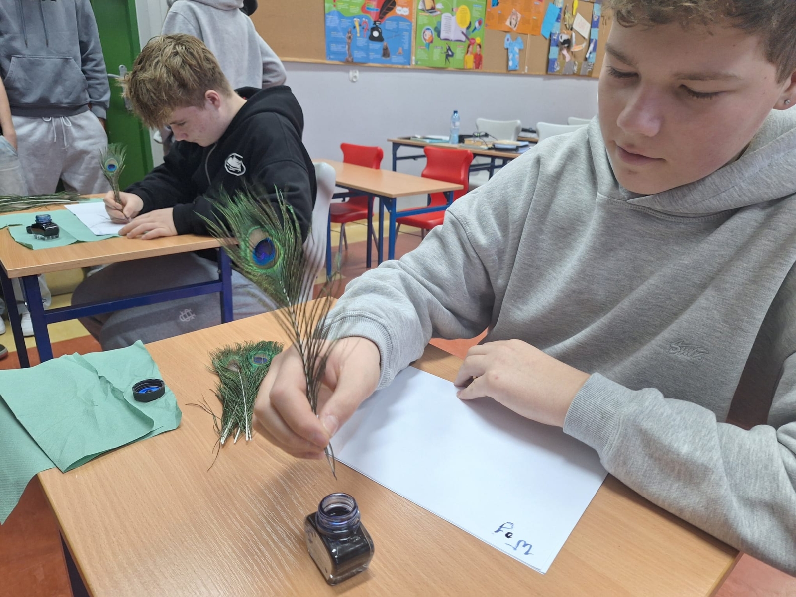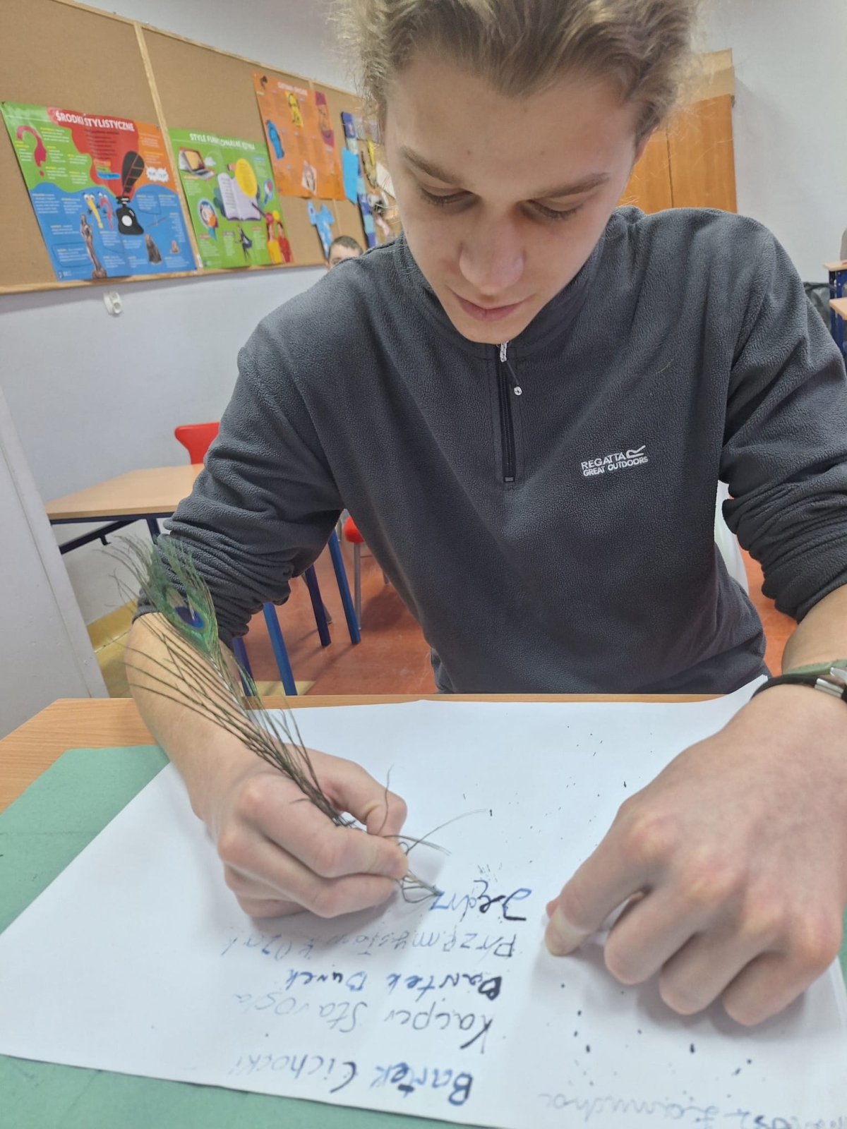 W naszej szkole podczas przerwy uczniowie bawili się z kaligrafią w sposób niecodzienny. Zamienili długopisy na pióra ptasie i atrament w kałamarzach. Kaligrafia jeszcze nigdy nie była tak fascynująca, co można zaobserwować na załączonych zdjęciach.