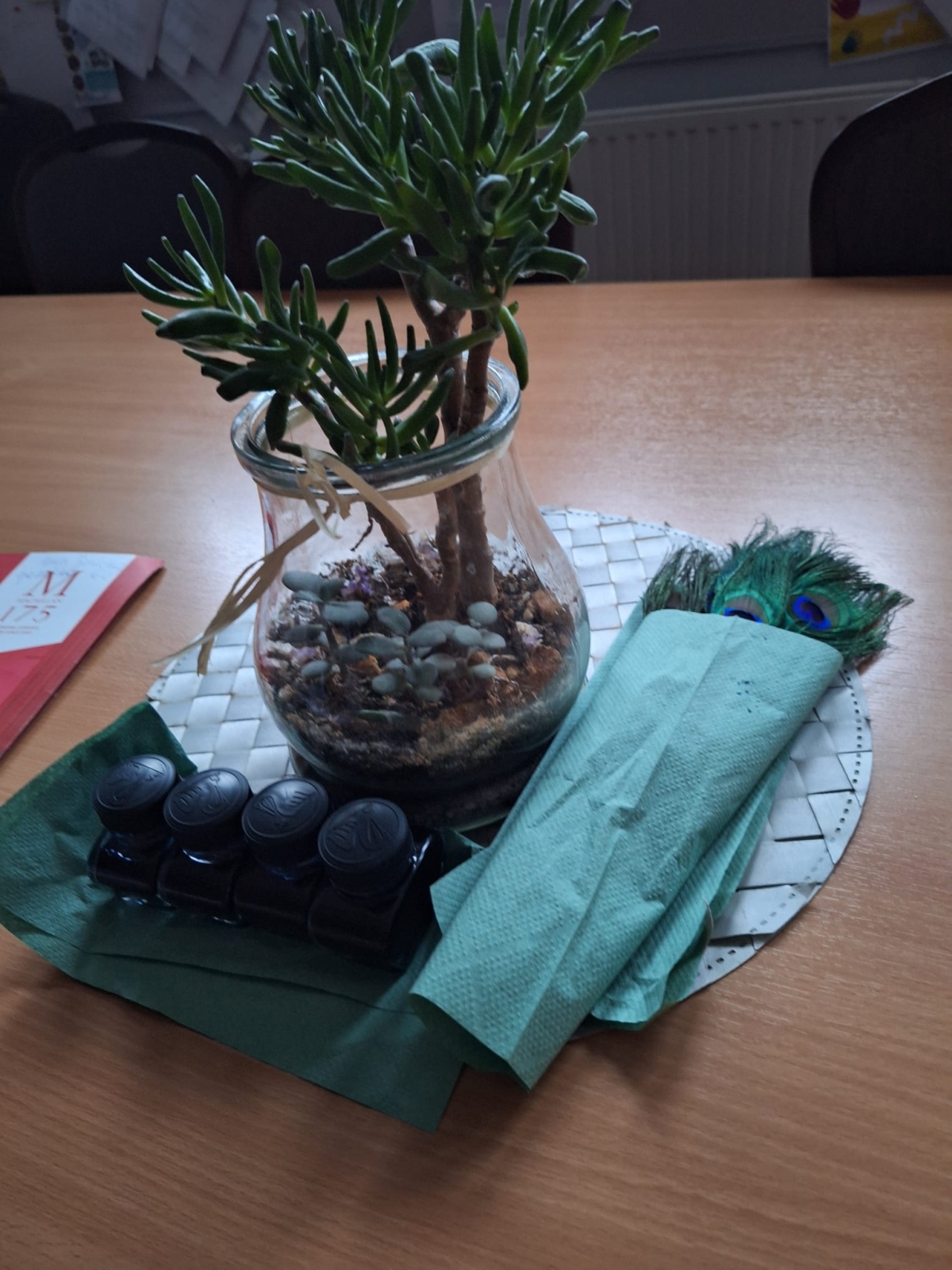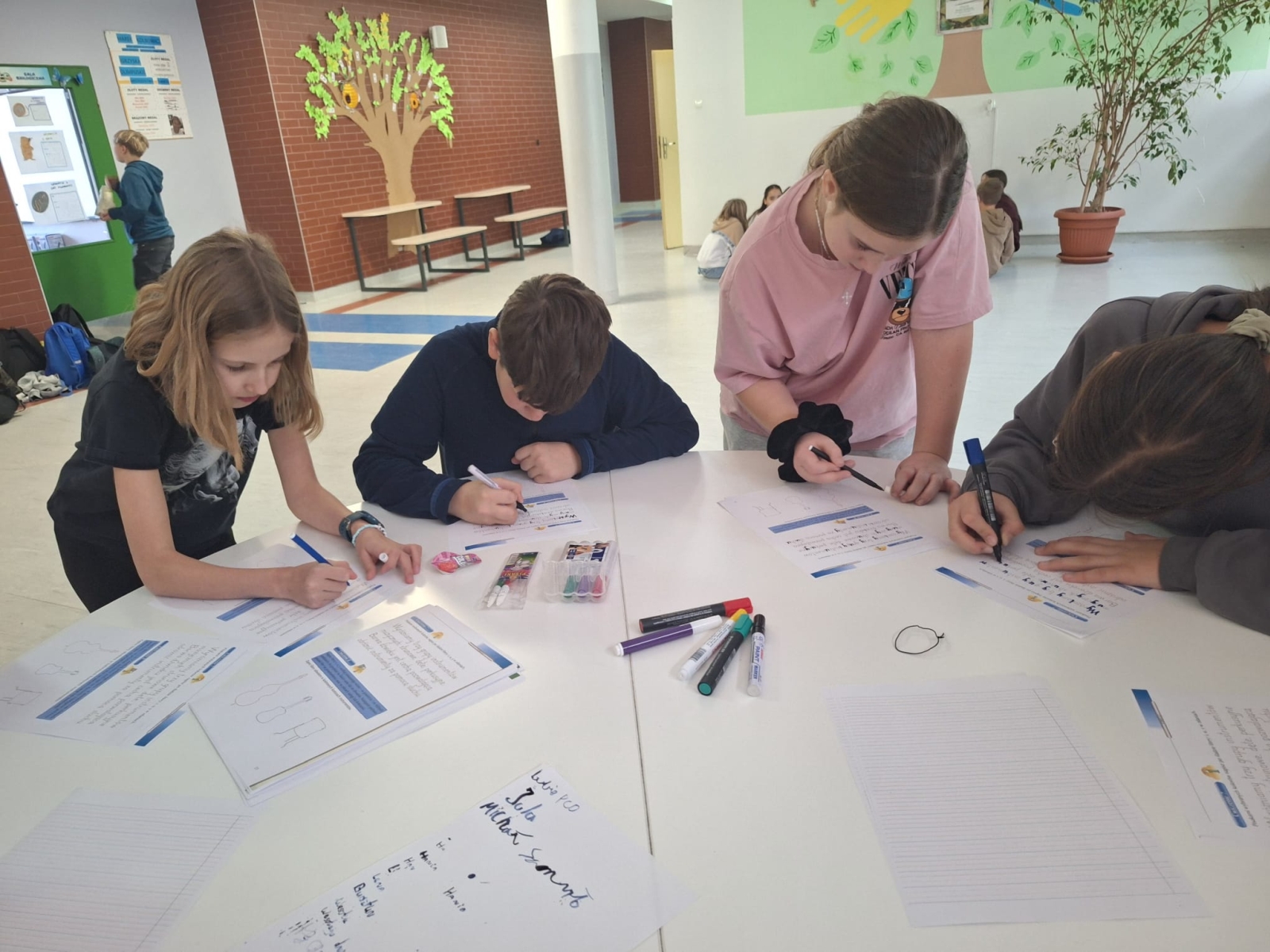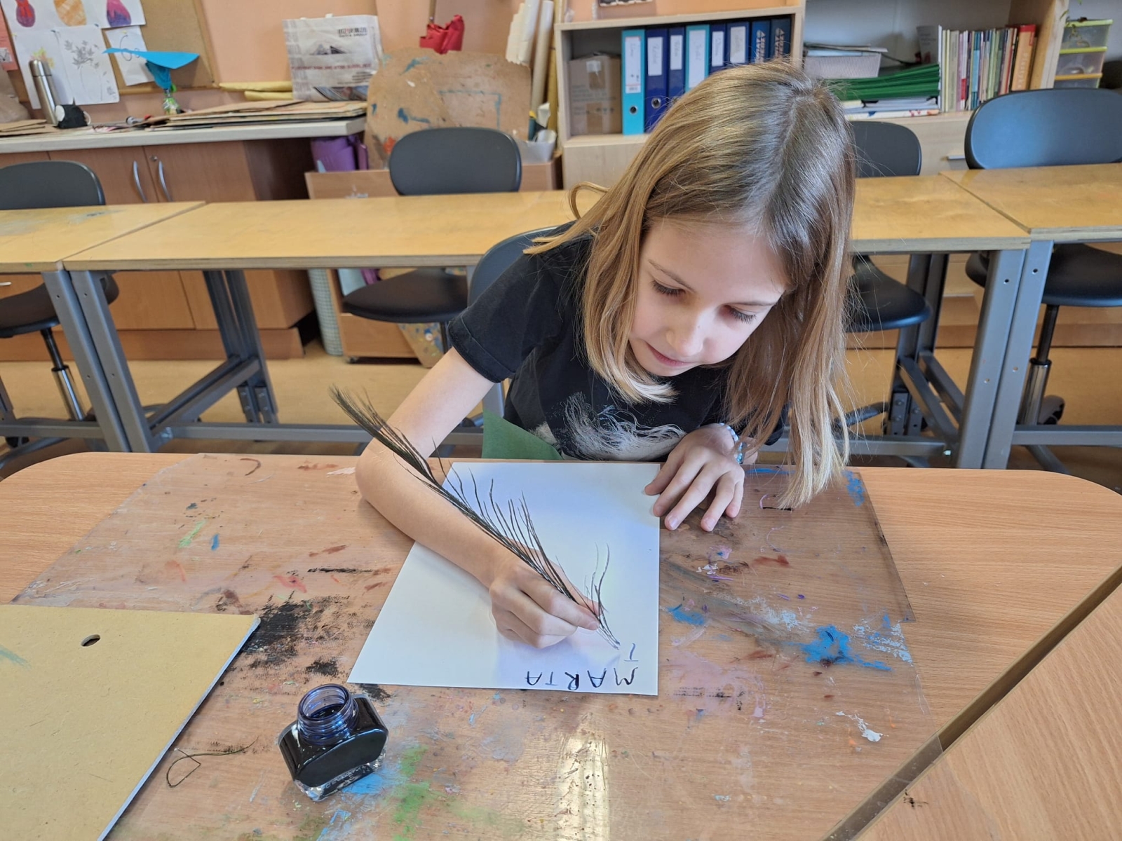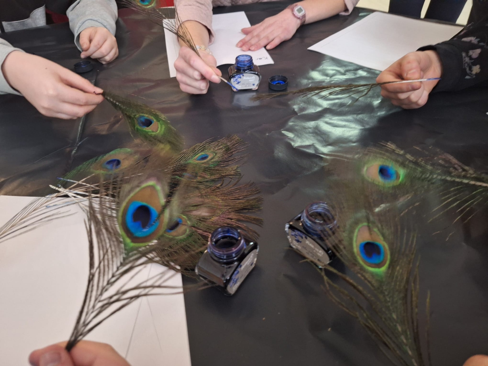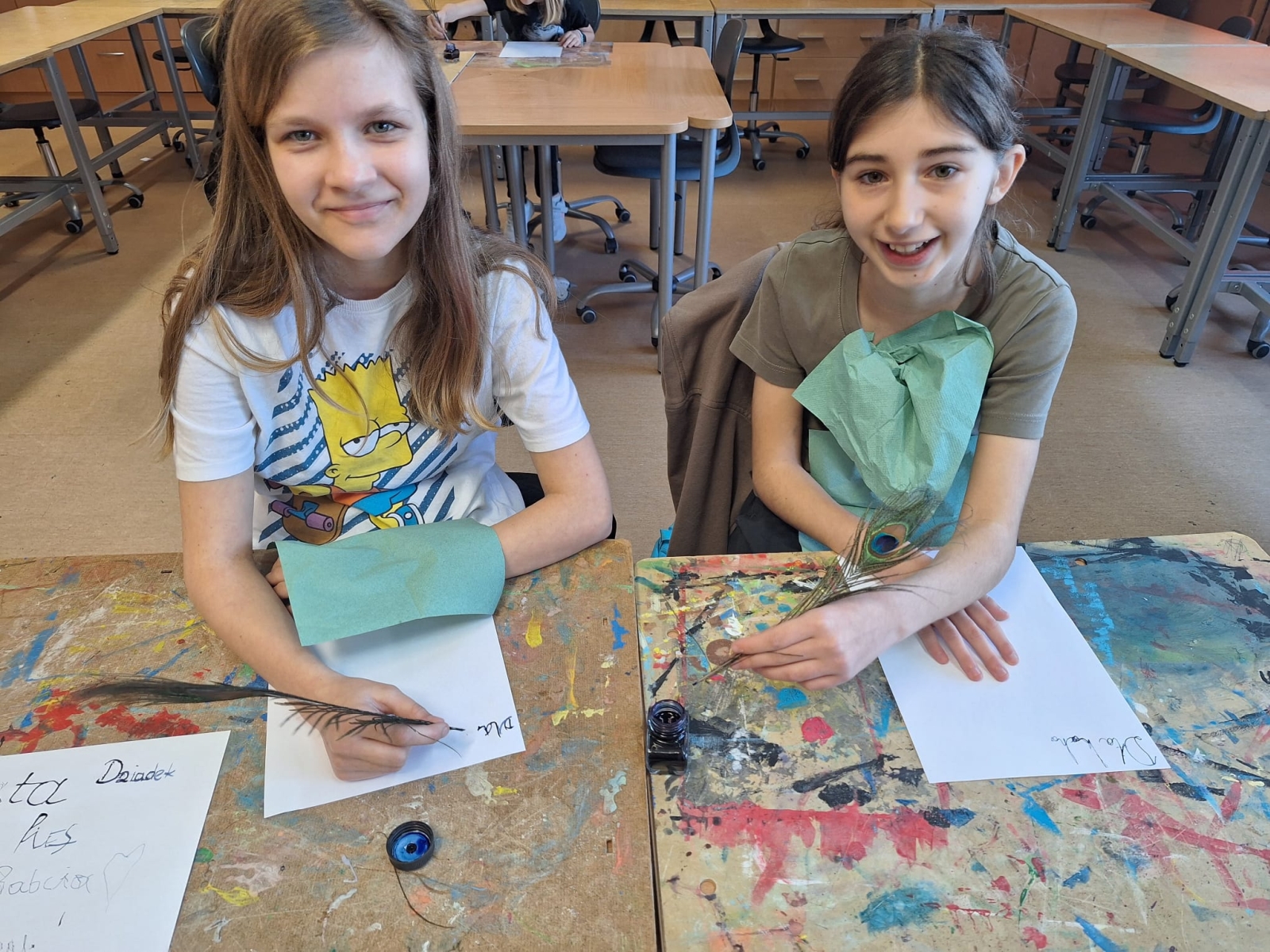 W naszej szkole podczas przerwy uczniowie bawili się z kaligrafią w sposób niecodzienny. Zamienili długopisy na pióra ptasie i atrament w kałamarzach. Kaligrafia jeszcze nigdy nie była tak fascynująca, co można zaobserwować na załączonych zdjęciach.