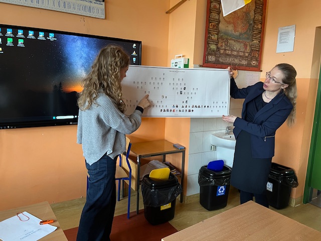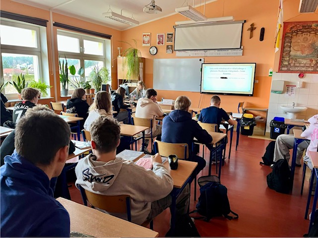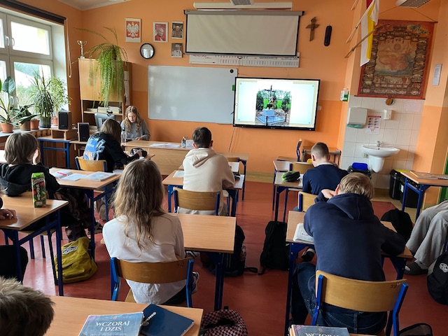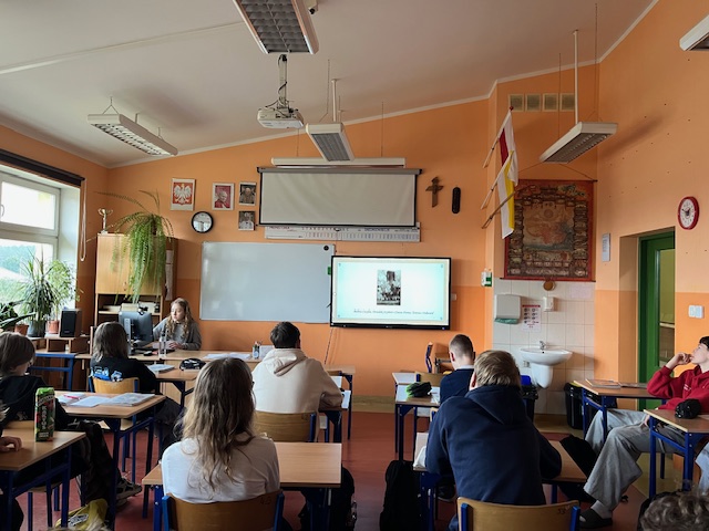 16 marca 2026 r. Agata z klasy 8 przeprowadziła innowacyjną lekcję historii na podstawie opracowanego drzewa genealogicznego swojej rodziny, zebranych dokumentów, zdjęć i wspomnień przodków na konkurs genealogiczny „Bez korzeni nie zakwitniesz. Moja Wielka i Mała Ojczyzna”. Konkurs organizują Archiwa Państwowe oraz Ministerstwo Edukacji Narodowej. Patronat honorowy nad konkursem objęła Minister Kultury i Dziedzictwa Narodowego Marta Cienkowska. Uczennica przeszukała „zakurzone” domowe szuflady, strychy, zasoby Internetu, „odkryła” domowe skarby, pamiątki, zdjęcia, archiwalne dokumenty, rozmawiała z członkami rodziny i złożyła wszystko, w jedną opowieść. Losy jej prapradziadków, pradziadków i dziadków zostały opowiedziane na tle historii Polski i świata. Usłyszeliśmy jak wielkie wydarzenia historyczne, czyli rozbiory, wojny, migracje, zmiany graniczne, represje czy PRL wpłynęły na losy naszych przodków. Dowiedzieliśmy się o emigracji jej członków rodziny do Ameryki i oglądaliśmy ich na starych fotografiach ze zbiorów rodzinnych. Ciekawa dla uczniów okazała się opowieść o dziadku Szymonie, który walczył w Armii Krajowej w ramach akcji „Burza” i wyruszył ze swoim kolegą na pomoc walczącej w powstaniu Warszawie. Nauczyciel w trakcie lekcji wyjaśniał kontekst historyczny niektórych perypetii rodzinnych.