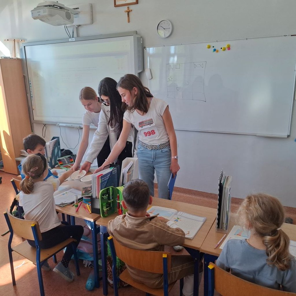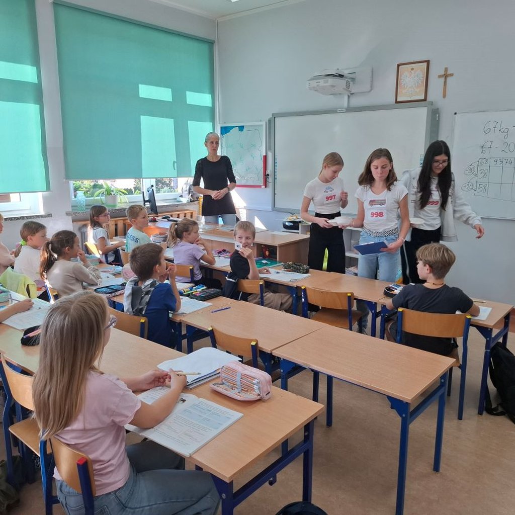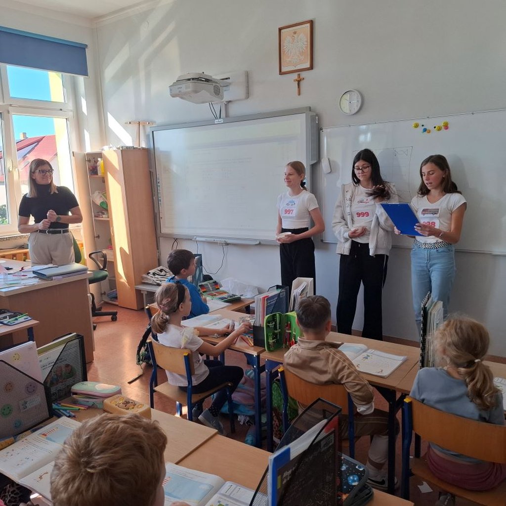 uczennice klas siódmych podarowały młodszym kolegom i koleżankom naklejki z numerami