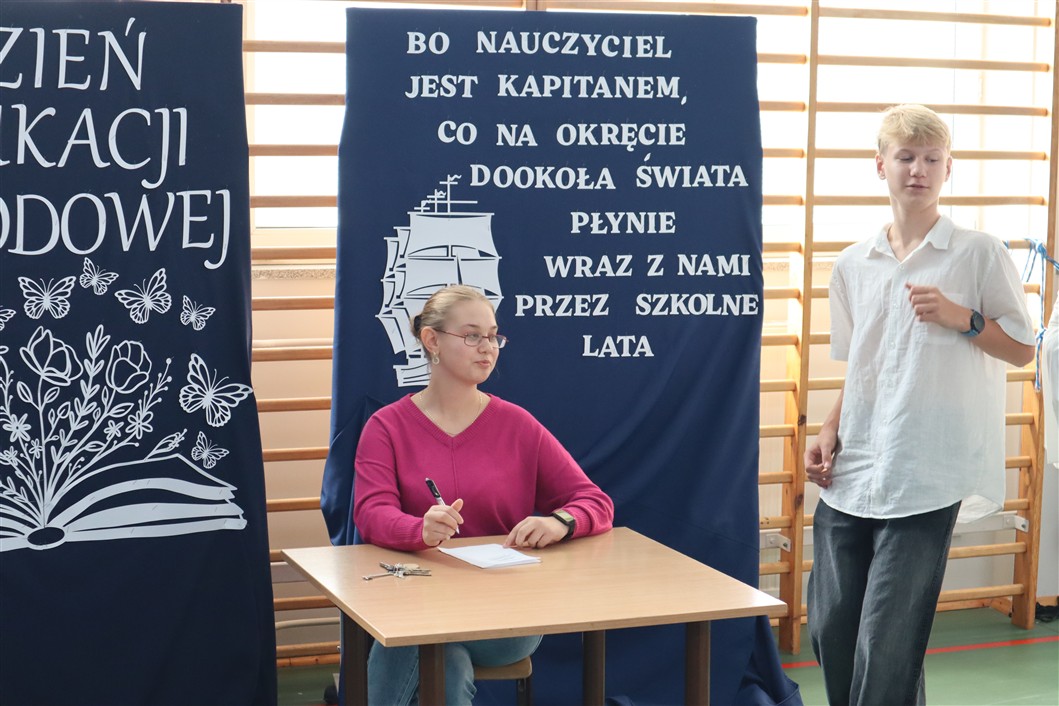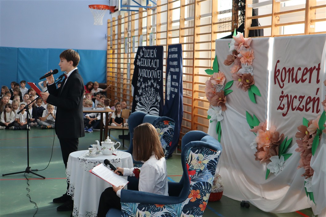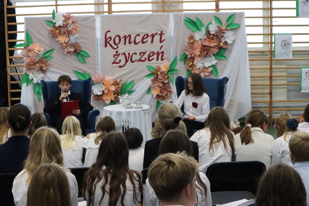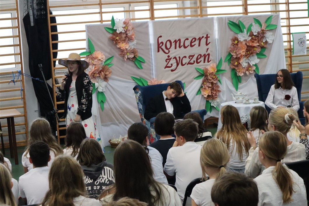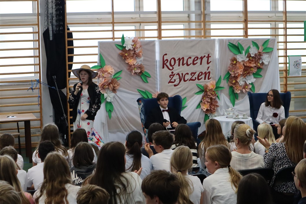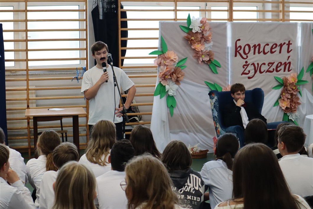 W piątek, 10.10.2025 r., w naszej szkole odbył się wyjątkowy Koncert Życzeń, który na długo pozostanie w pamięci zarówno pedagogów, jak i uczniów. Wydarzenie miało formę uroczystego apelu, podczas którego prowadzący – niczym radiowi prezenterzy – siedzieli przy stylowo udekorowanym stoliku i z humorem zapowiadali kolejne muzyczne występy.