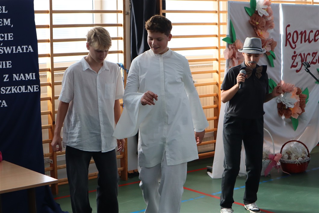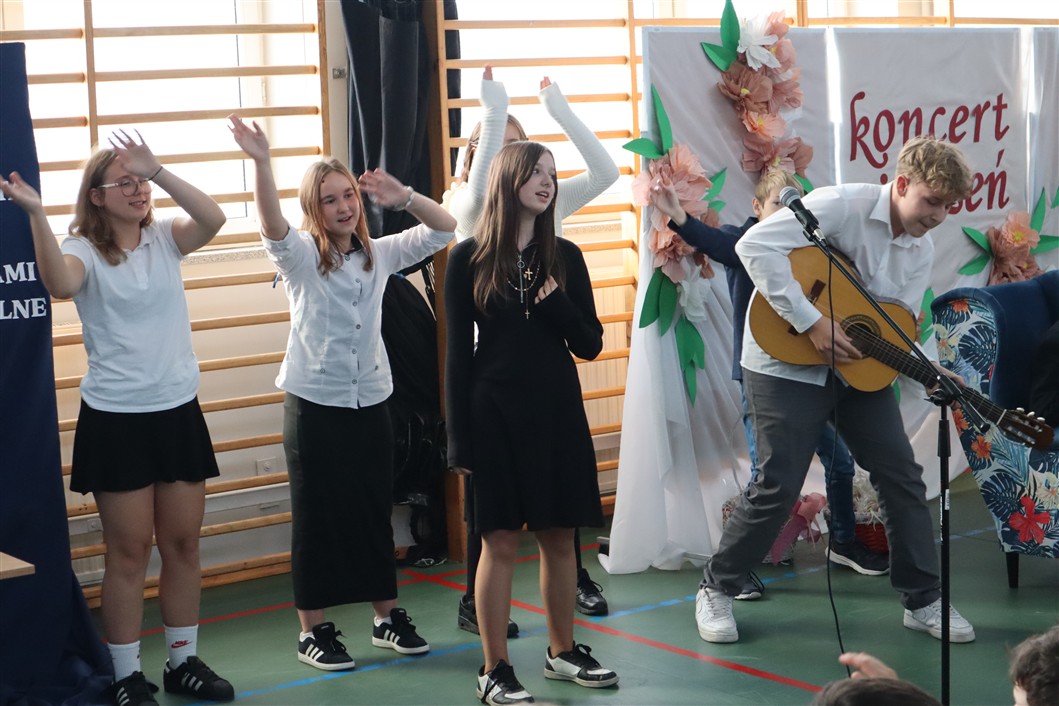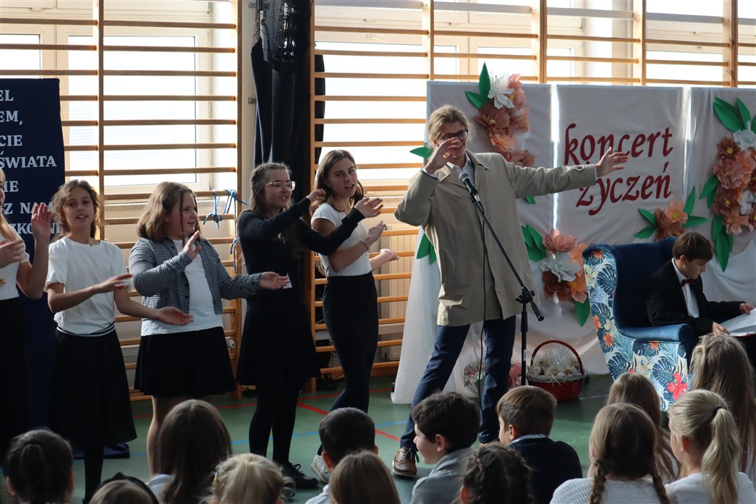 Na scenie pojawiali się uczniowie z różnych klas, prezentując utwory dedykowane nauczycielom. Nie zabrakło parodii znanych piosenek, które wywoływały salwy śmiechu i dodawały wydarzeniu lekkości. Każdy występ był starannie przygotowany, a różnorodność repertuaru sprawiła, że koncert był dynamiczny i pełen pozytywnej energii.