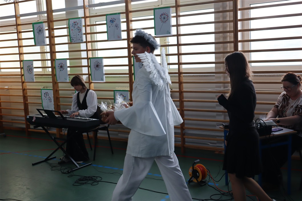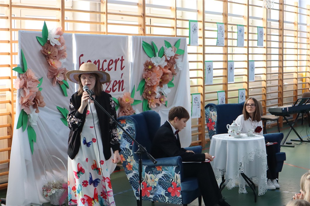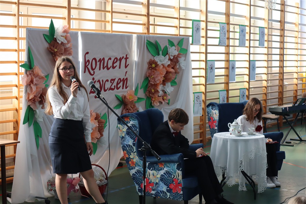 Cała społeczność szkolna włączyła się w przygotowania. Uczniowie ze wszystkich klas wykonali ozdobne dekoracje, które nadały sali wyjątkowy, świąteczny klimat. Kolorowe plakaty i kwiatowe kompozycje stworzyły atmosferę pełną ciepła i uznania.