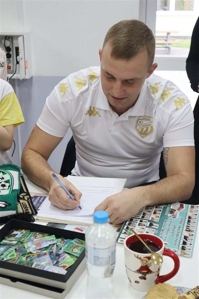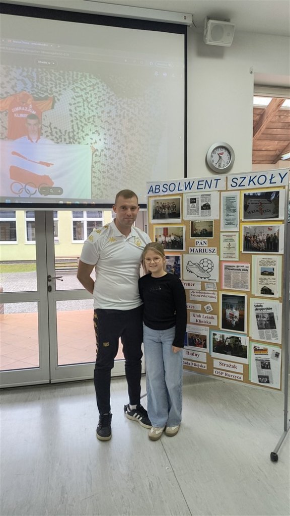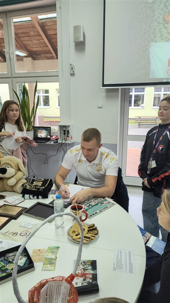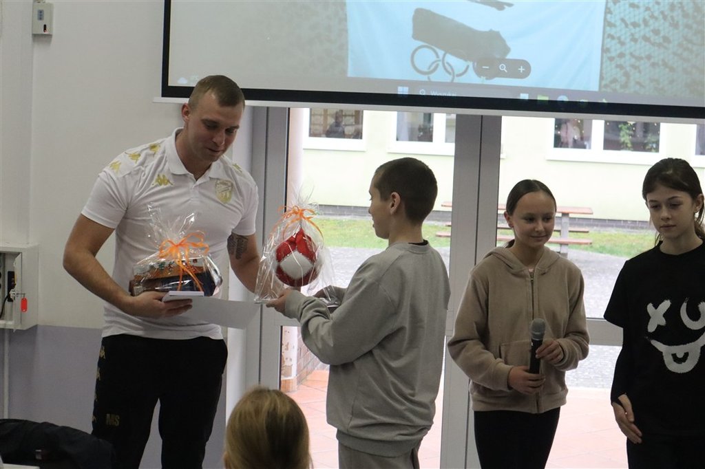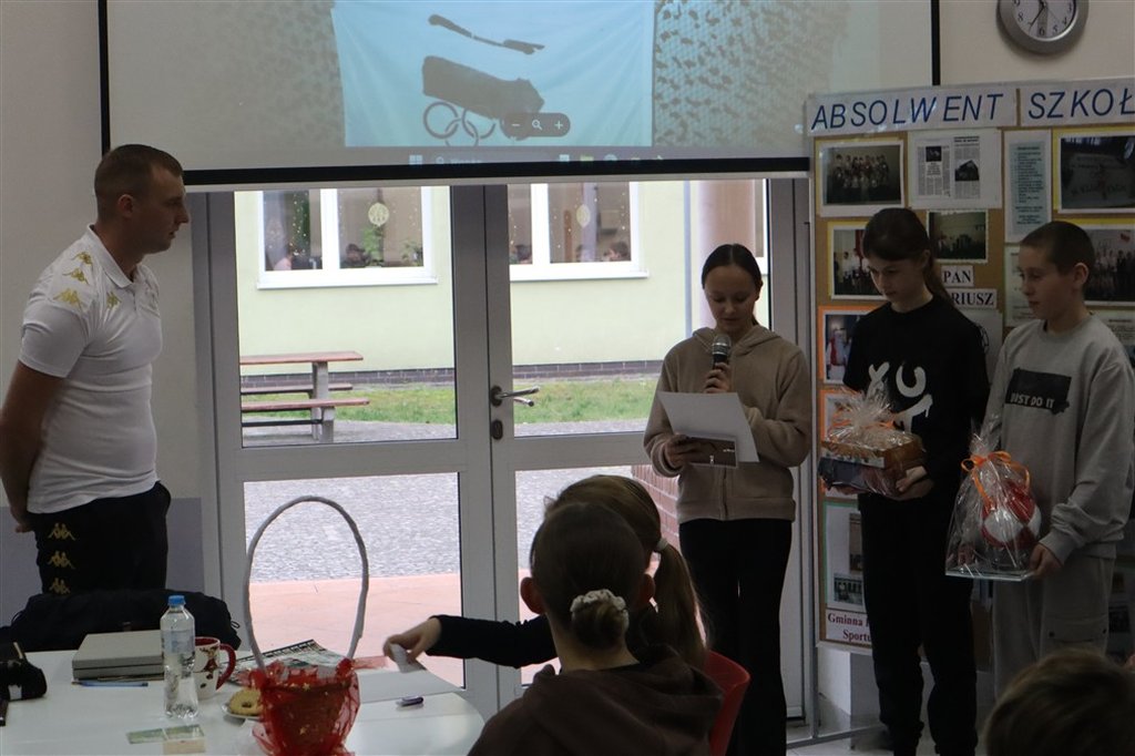 Na zakończenie Pan Mariusz wręczył Pani Dyrektor pamiątkowe szaliki klubu „Leśnik Kliniska” oraz zaprosił szkołę do współpracy na płaszczyźnie sportowej. Spotkanie prowadziły uczennice: Hania z klasy 3c i Natalia z klasy 5a. W ramach podziękowania wręczone zostały drobne upominki, w tym prace przygotowane przez uczniów (wręczyli je uczniowie: Viktoria z klasy 6a, Filip z klasy 6c i Nadia z klasy 5b).