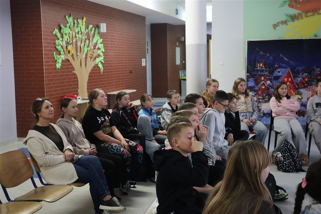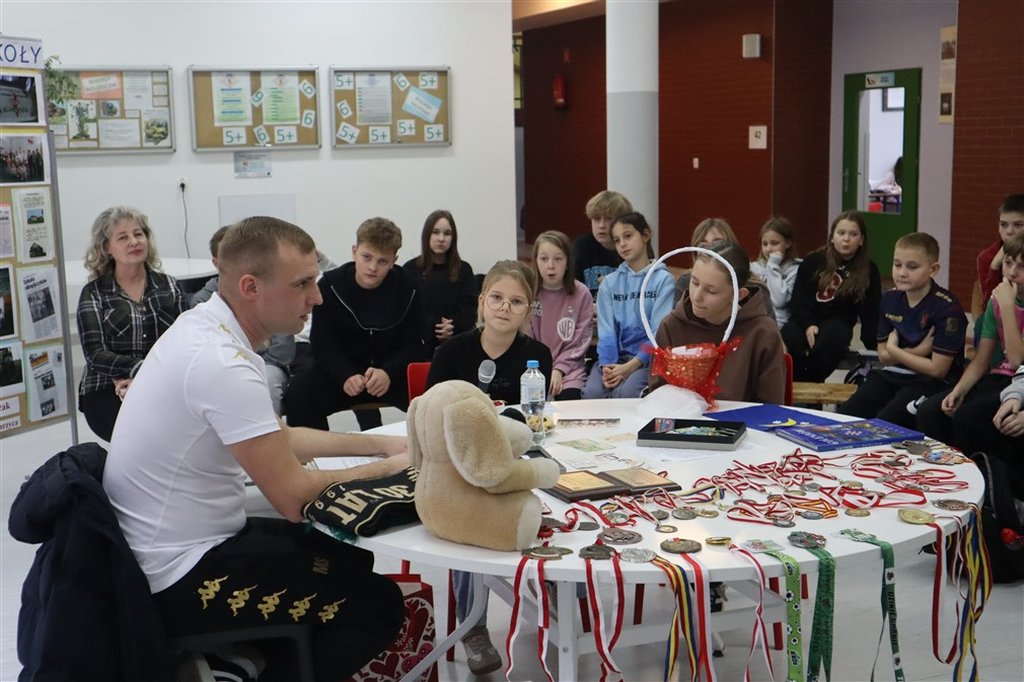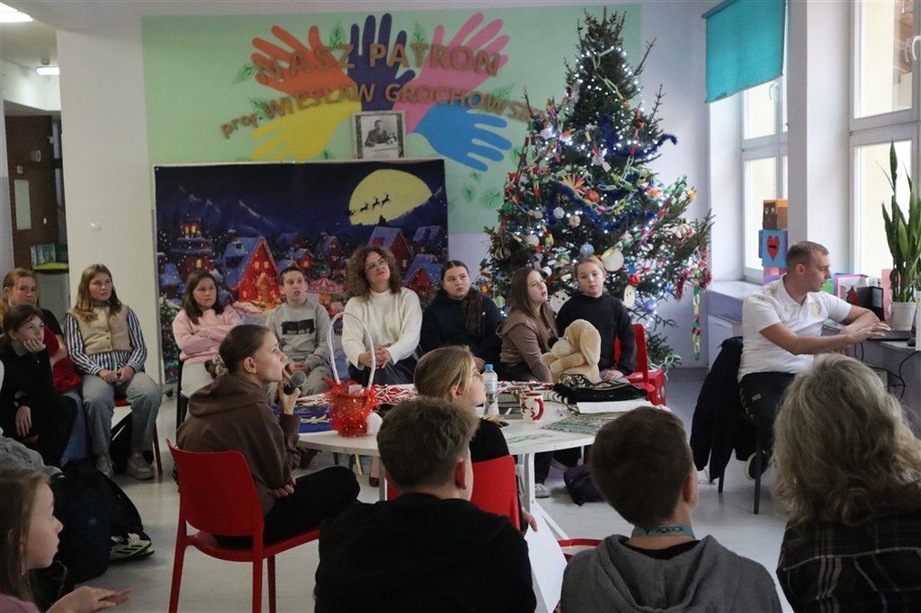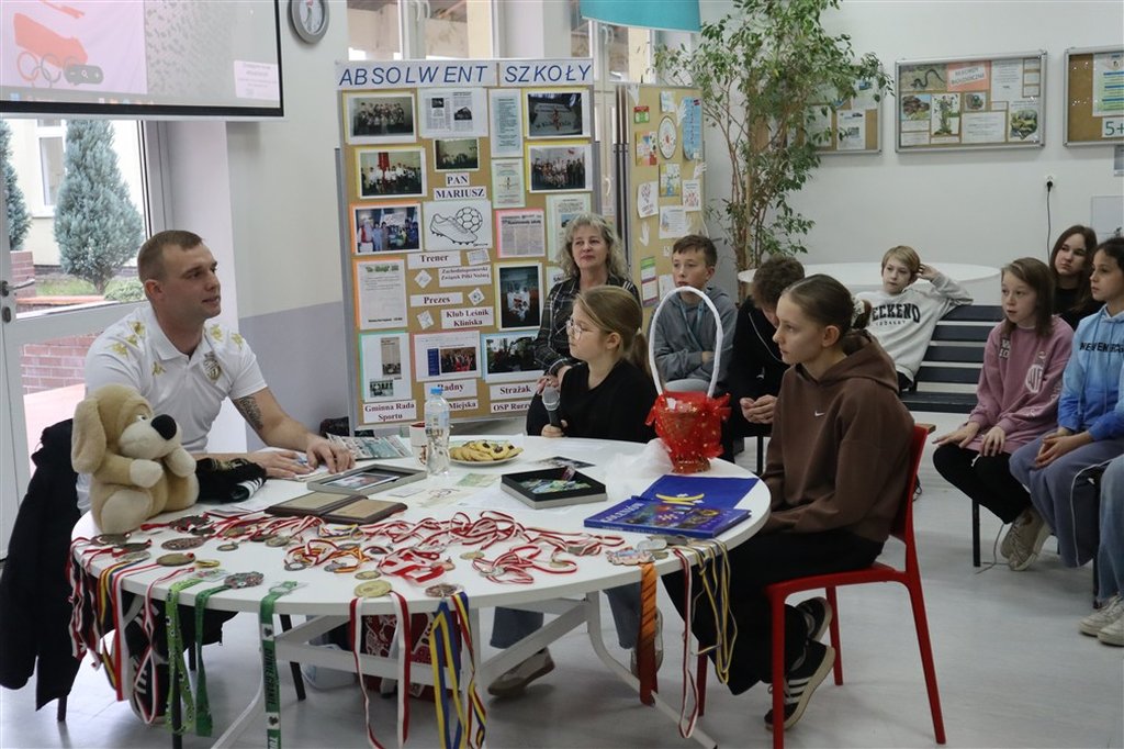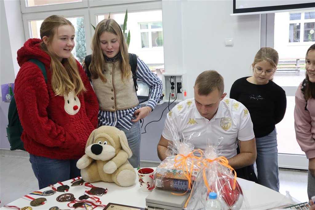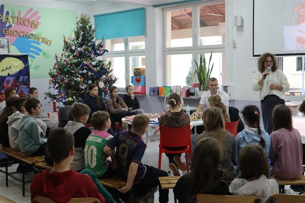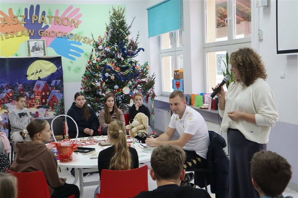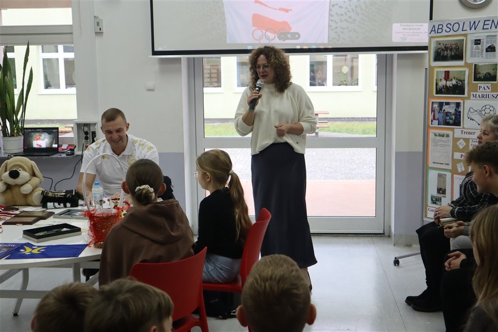 W tej wyjątkowej scenerii odbyło się ważne dla szkoły wydarzenie. W środę, 17.12.2025 roku, gościł w naszej szkole Pan Mariusz Skakuj - absolwent Szkoły Podstawowej im. prof. Wiesława Grochowskiego oraz byłego Gimnazjum im. Polskich Olimpijczyków.