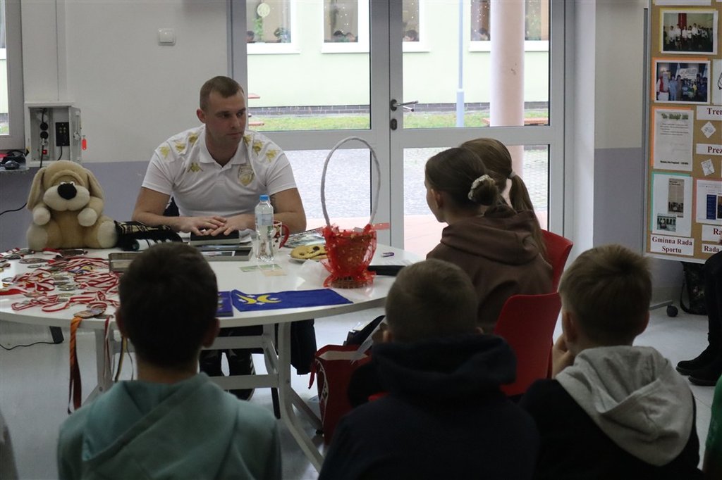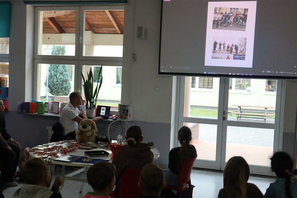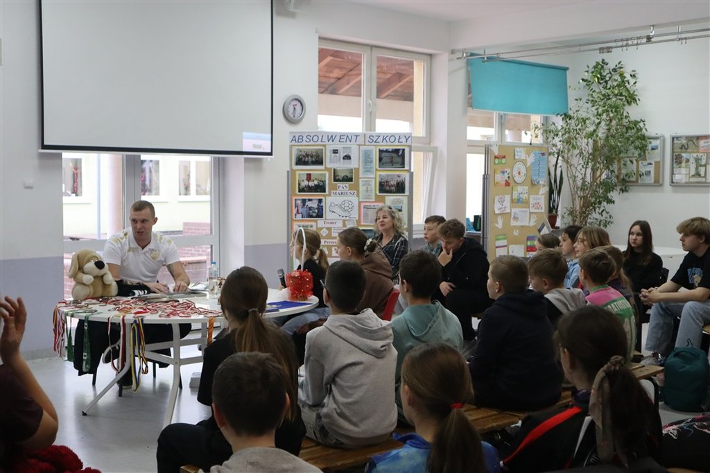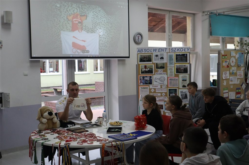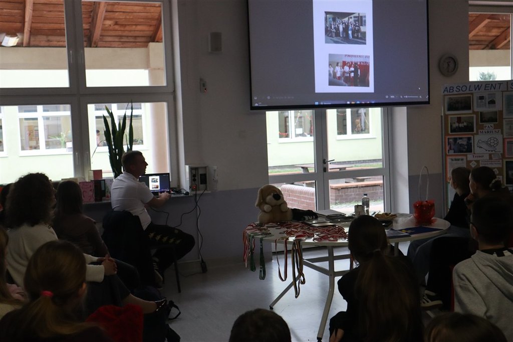 Podczas spotkania p. Mariusz odpowiadał na pytania uczniów, które dotyczyły m.in. pierwszych lekcji w szkole, ulubionych miejsc do spędzania wolnego czasu oraz popularnych wówczas zabaw. Opowiadał szkolne historie, zwracając uwagę na cenne wartości, jakimi powinni kierować się uczniowie. Zachęcał do pracy na rzecz szkoły i innych ludzi. Swoje opowieści opierał na pokazie zdjęć z różnych miejsc i wydarzeń (m.in. miast dotkniętych powodzią, etapów powstawania boiska, czy organizacji dużych imprez sportowych). Pan Mariusz przyniósł ze sobą wiele cennych pamiątek, m.in. medale, nagrody, prace techniczne, legitymacje członkowskie, karty, maskotkę od Mikołaja z Pałacu Prezydenckiego z 2002 roku, ale również słodkie upominki dla wszystkich.