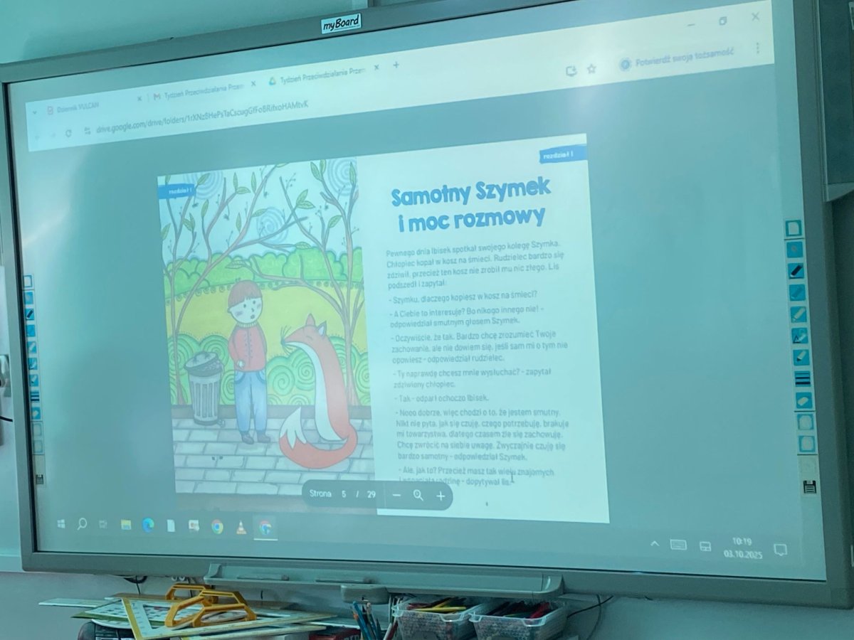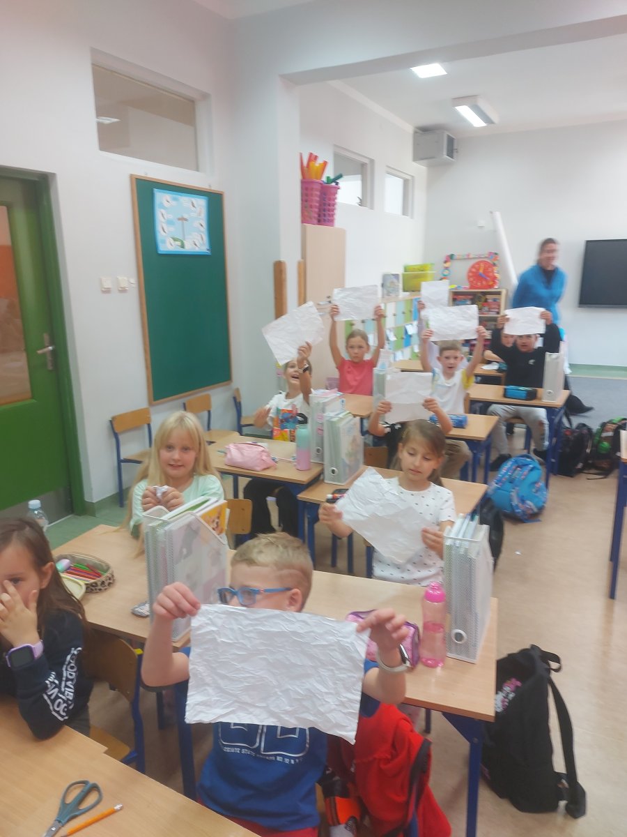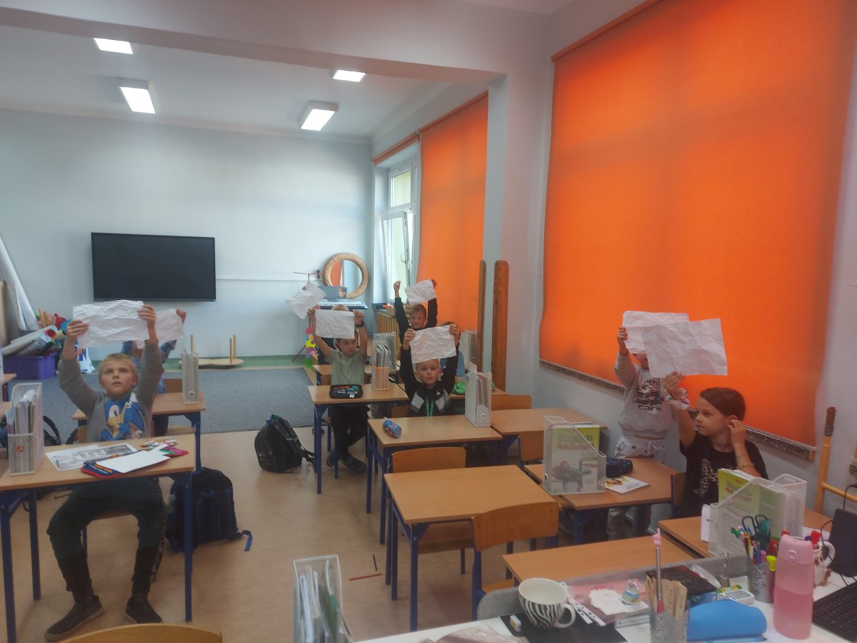 Klasa 2a wysłuchała bajki o Lisku Ibisku. Po wysłuchaniu uczniowie wzięli udział w warsztatach, podczas których poznawali sposoby radzenia sobie z trudnymi uczuciami. Praktykowali m.in. tupanie ze złości, aż do utraty sił, a także zgniatali kartkę symbolizującą skrzywdzoną osobę – próba jej wyprostowania pokazała, że mimo przeprosin ślady mogą pozostać.