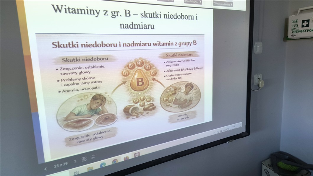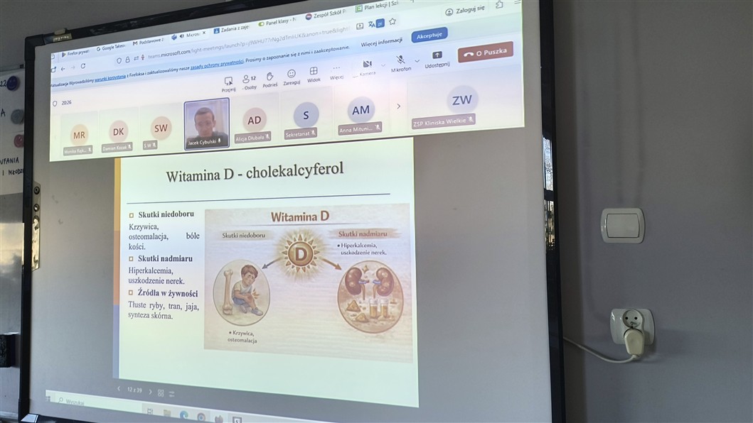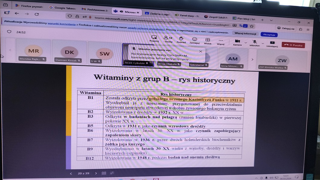 Czy wiecie, że witaminę B1 odkrył Polak – Kazimierz Funk – w 1911 roku? Które witaminy są rozpuszczalne w tłuszczach, a które w wodzie? Jak wygląda talerz zdrowego żywienia? Na te i wiele innych pytań szukaliśmy odpowiedzi podczas ostatnich zajęć online naszego Szkolnego Koła Ligi Ochrony Przyrody (06.03.2026). Oddział Szczeciński Polskiego Towarzystwa Przyrodników im. Kopernika zaprosił nas do udziału w zajęciach prowadzonych przez dr inż. Jacka Cybulskiego na temat „Podstwowe źródło i znaczenie składników pokarmowych dla prawidłowego funkcjonowania organizmu na przykładzie witamin”.